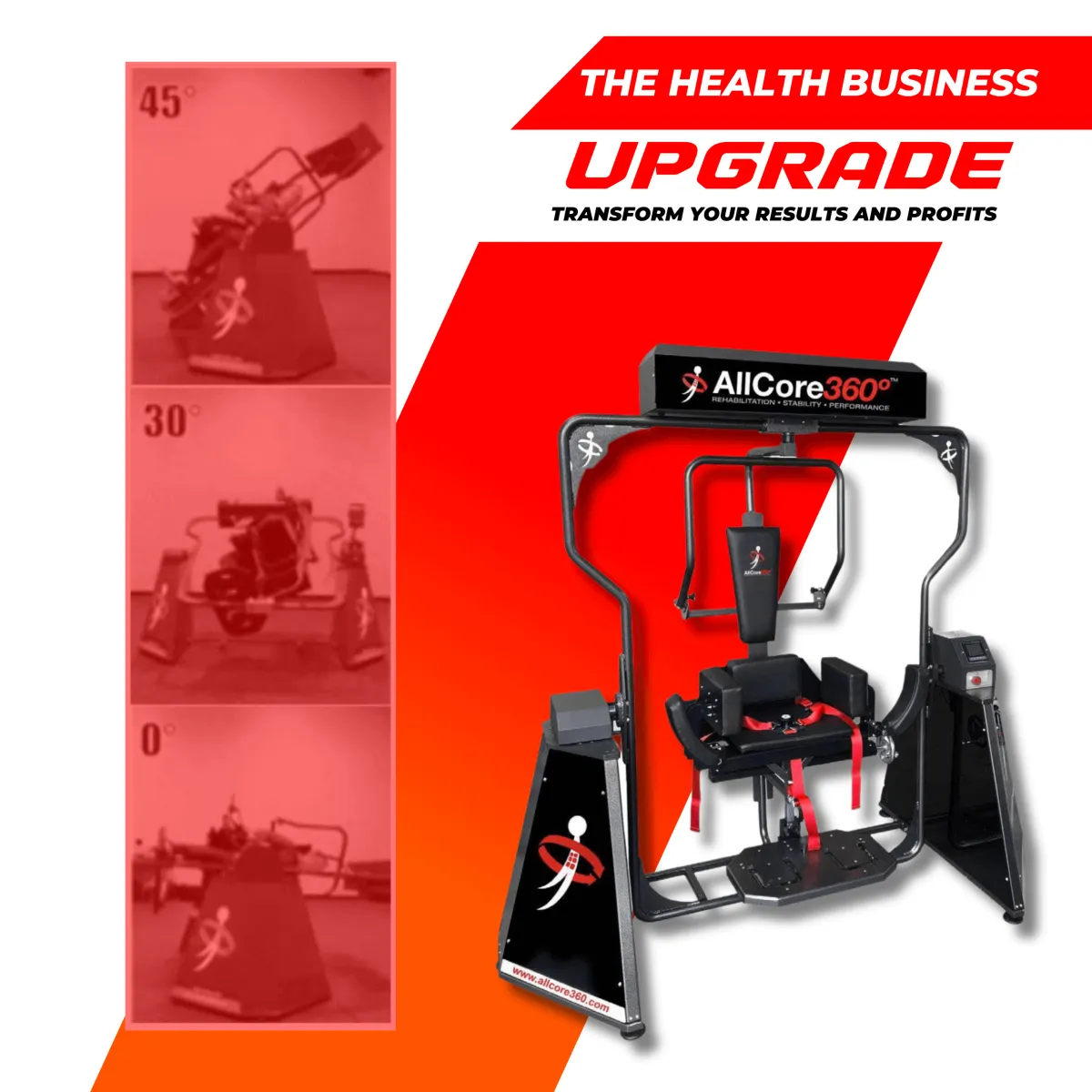 The AllCore360° is the perfect resistance training tool. With all of the positive results that our staff and patients have experienced, the financial and non financial returns have easily surpassed our expectations.” I believe it to be the single best piece of equipment to strengthen every core muscle in the body, evenly, safely and effectively. This will help every person under our care whether they are rehabilitating from an injury, needing stabilization to prevent future injuries, or just wanting to improve performance in all phases in their life. The AllCore360º is the single best piece of equipment to strengthen every core muscle in the body, evenly, safely, and effectively. This will help every person under our care whether they are rehabilitating from an injury, need stabilization to prevent future injuries, or just want to improve performance.