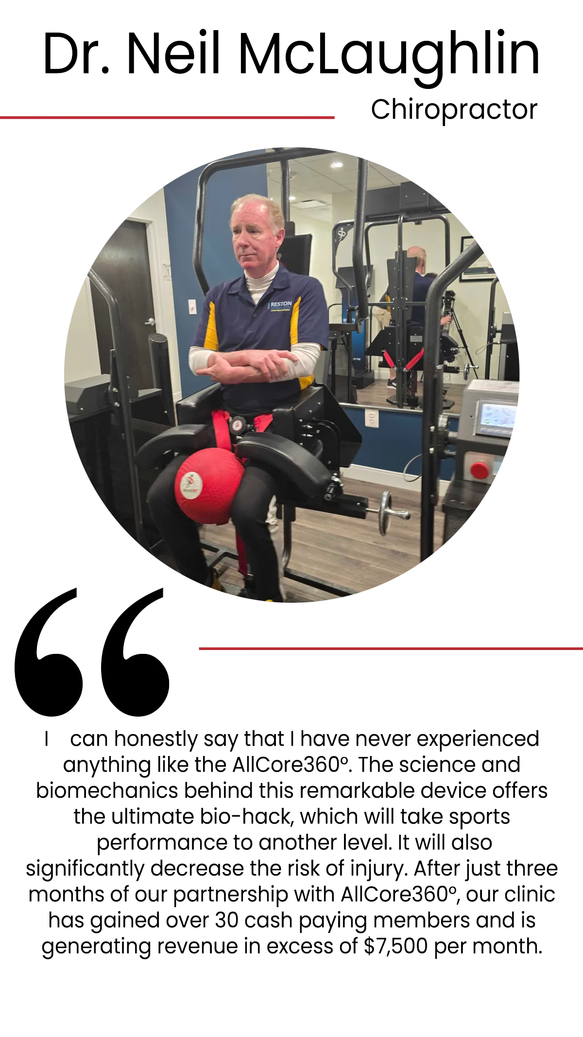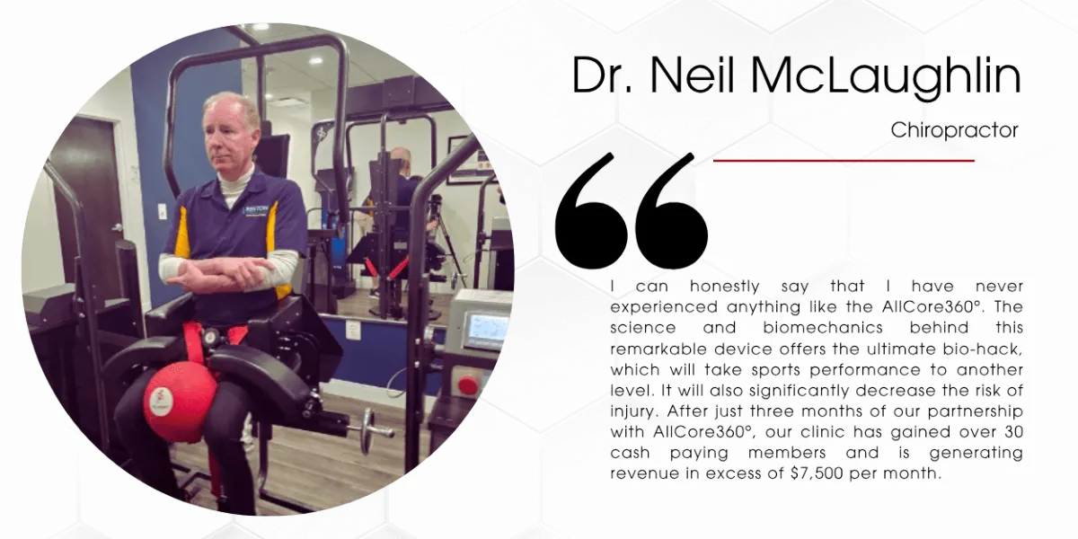 The AllCore360° is a game changer. As a clinician, we have our everyday approaches, but we need to step outside of the box to invite different perspectives on the paradigm that we once had, and look at ways that we can enhance in a short period of time. It really comes down to if people can experience it, and if they can feel it. By feeling it and seeing it, patients are more inclined to see how much practice plays a role in their overall health and wellbeing, especially in relation to their spinal health. The AllCore360° is just that practice. The AllCore360° the single best rehabilitative instrument a clinic can process to address core deficiency and chronic low back pain.